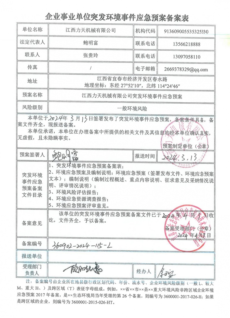 江西力天機械有限公司突發環境事件應急預案評審意見修改說明