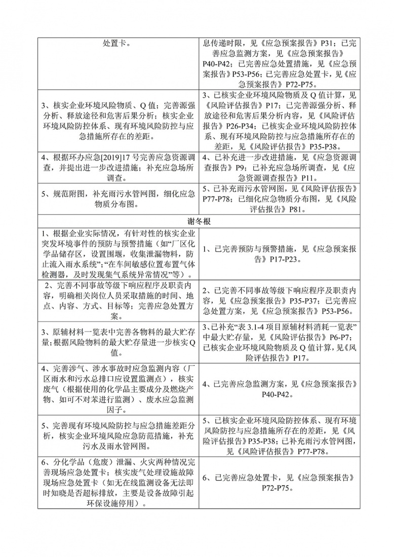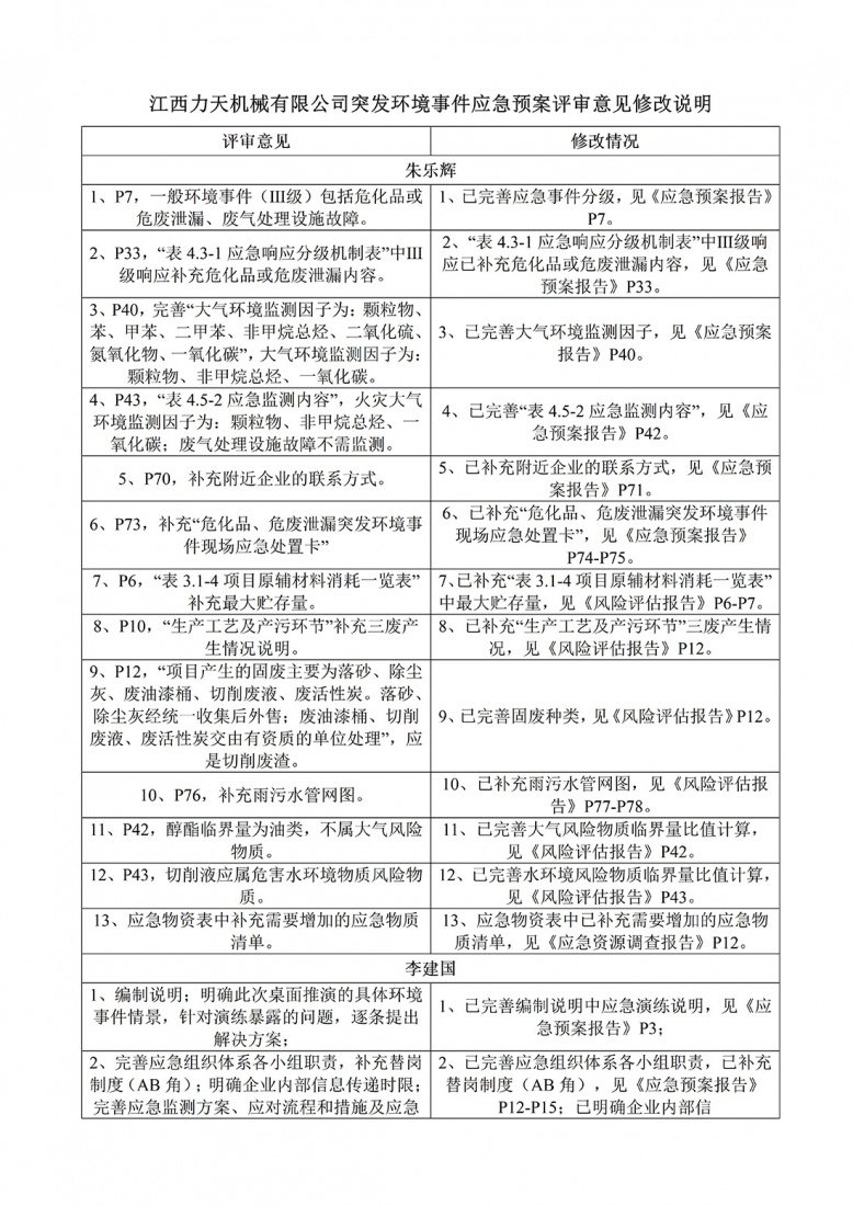 江西力天機械有限公司突發環境事件應急預案評審意見修改說明